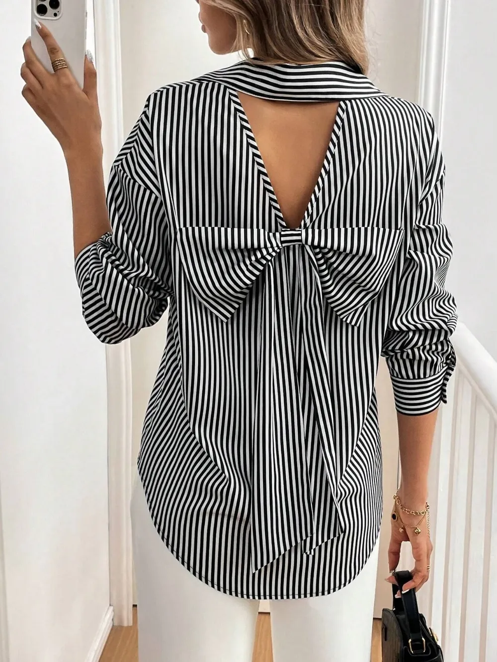 Cutout Bow Back Striped Collared Neck Long Sleeve Shirt