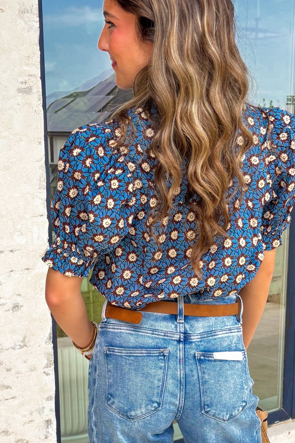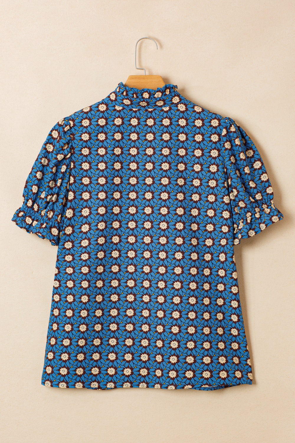 Floral Print V Neck Pleated Detail Short Puff Sleeve Blouse