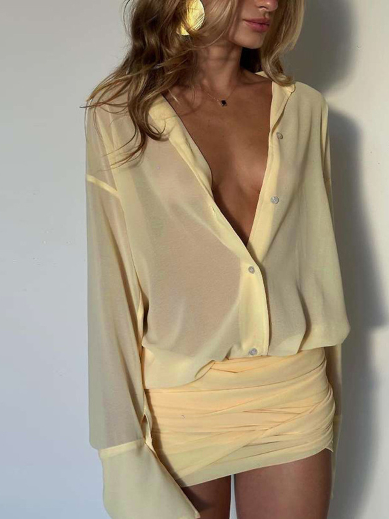 Sheer Button-Down Mini Shirt Dress With Back Tie