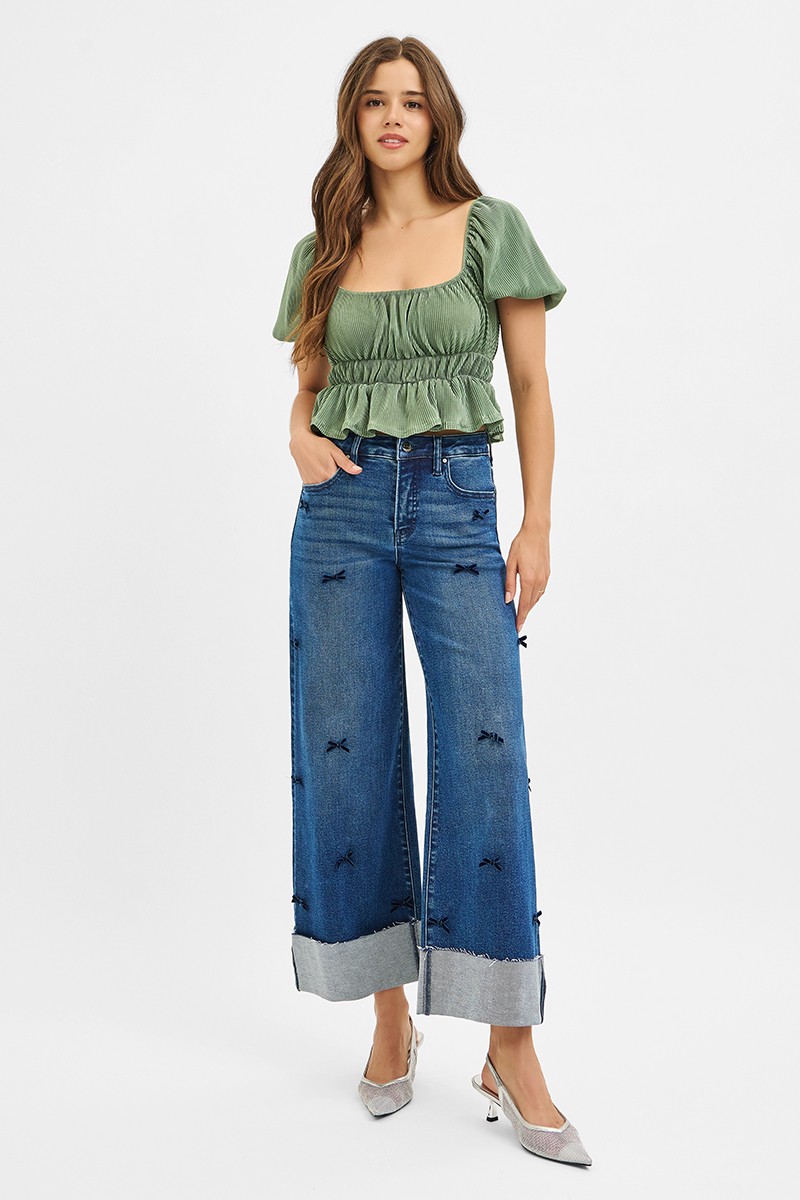 Risen High Rise Crop Wide Leg Ribbon Detail Jeans